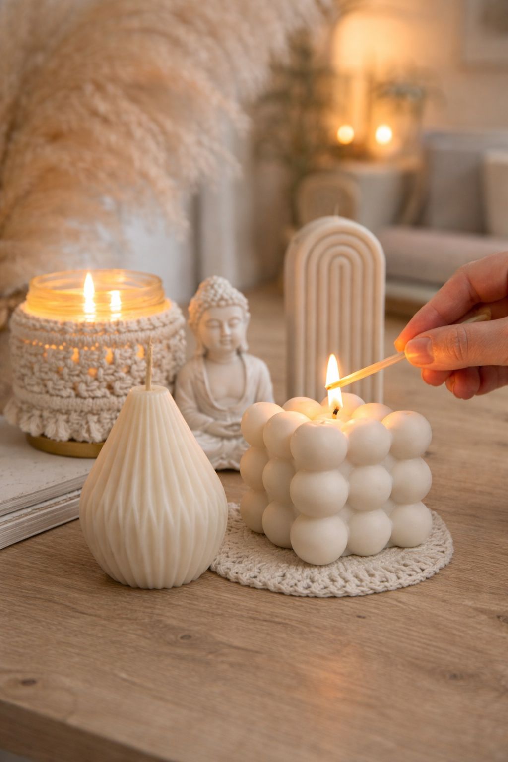 Cada pieza es creada con intención, convirtiéndose en un objeto que no solo ilumina, sino que también aromatiza y armoniza espacios y emociones.